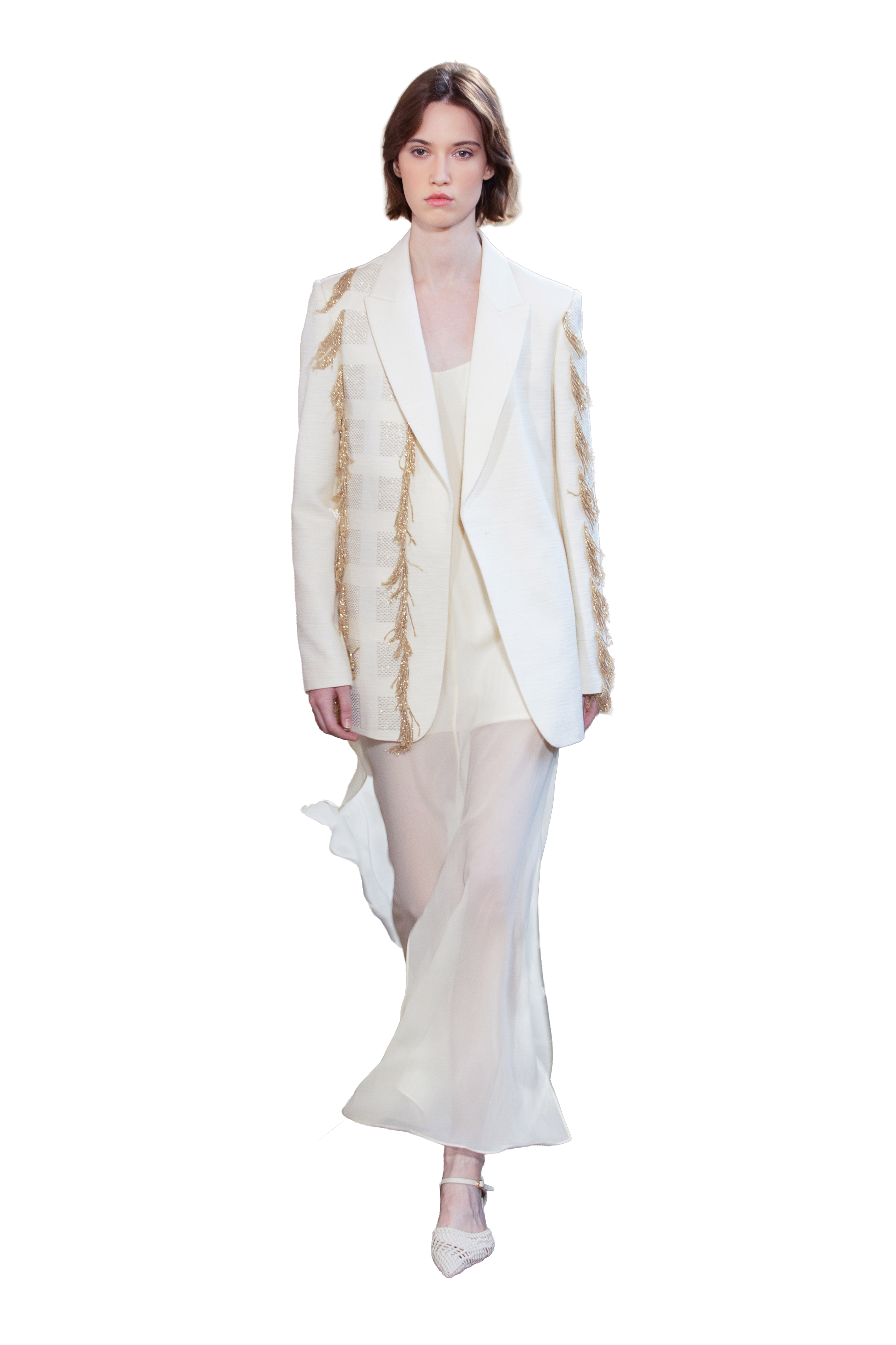 Lors du Laurèl Shenzhen Futian Day, la marque a présenté sa collection haute couture à la Monnaie de Paris. Cette collection se distingue par des coupes structurées et un jeu audacieux de couleurs et de matières. On y découvre de longues jupes en soie noire, du lin travaillé avec élégance, ainsi qu’un blouson en cuir marron clair. Une robe brodée transparente couleur chocolat apporte une touche sensuelle et raffinée. Le rose s’invite également à travers des vestes et gilets portés avec un jean, ou encore un ensemble rose clair composé d’un blouson, d’une veste et d’un short assortis. Une veste blanc cassé à franges dorées vient compléter ces silhouettes contemporaines et lumineuses. Côté accessoires, la pièce incontournable reste le sac à main tricolore,gris, blanc et noir, idéal pour parfaire chaque tenue avec équilibre et élégance.